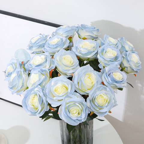 Paquetes de 47cm Diamante Seda Rosa Salón de bodas Flor azul claro 9 cabezas Rosas blancas Flores artificiales